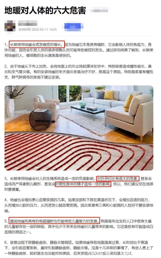 同时这些文章还列举了关于地暖的几大危害,最典型的一篇就是《地暖对人体的六大危害》被疯狂传播。